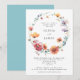 This design features a delicate watercolor wreath made of wildflowers in shades of blue, red, orange, violet, and gold. Perfect for spring and summer outdoor celebrations.