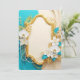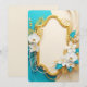 "Stunning elegant design featuring a luxurious ornate gold frame centered on a sophisticated split background of vibrant turquoise and soft cream waves. Beautiful white orchids with delicate yellow centers bloom alongside shimmering gold palm leaves, teal foliage, and cascading pearl and gold bead strands with sparkling highlights.