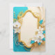 The rich contrast of metallic gold, pure white flowers, and bold turquoise gives it a high-end, tropical-luxe feel with timeless appeal."
