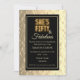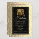 Elegante preto e ouro 50º convite de aniversário para ela. Ele apresenta um estilo antigo "Ela tem 50" "& Fabulosa" em texto dourado com todos os detalhes do partido em ouro sobre um fundo preto moderno. Excelente para celebrar o marco (30, 40, 50, 60, 80, 100) aniversários em estilo, este convite adiciona um toque de glamour a qualquer partido.