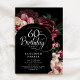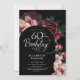 Elegante floral 60º convite de aniversário. Belo design com sotaques botânicos. Apresenta peões burlões e cor-de-rosa, rosas sobre fundo de moagem escuro e letra de script de tipografia de tendências. Você pode escolher convites impressos e/ou fazer o download instantâneo do modelo digital. Personalize com seus próprios detalhes. Perfeito para uma comemoração de dia das mulheres na moda.