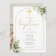 Apresentando delicadas folhas de cor d'água verde e um elegante arco e crucifixo de ouro, este convite batismo com a dimensão do gênero chic neutro pode ser personalizado com suas informações especiais e fotos no verso. Projetado por Thisnotme©