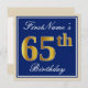 Estas características simples e da bolsa mensageifesta de aniversario elegante do convite de design uma mensagem personalizada como de "aniversário FirstName o 65th" (com "65th" tendo o falso/imitação ouro-como o olhar da coloração) dentro de uma área quadrada azul-colorida que caracteriza um esboço de beira simples. O nome em um elegante branco-é colorido roteiro-como o texto, e pode ser personalizado. A parte traseira caracteriza detalhes customizáveis do convite. Um convite de aniversário como este poderia talvez ser usado ao convidar pessoas a uma festa de aniversário que está sendo guardarada para alguém que está comemorando seu sessenta quintos aniversários. [~Z0000228]