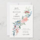 Elementos: trabalho de arte floral de cor-de-água macia com flores silvestres em um encantador enxame. Fontes clássicas de serif com acentos animados de script. Cores: azul empoeirado, pincel, rosa, verde, vermelho, lacre, sábio. Temas: elegante, cottage, botânica, boho, jardim, primavera, verão, país. Coleção: Elegante Dusty Blue e Rosa Floral Swag Coleção de Produto: Convites de Casamento