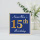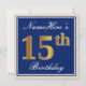 Este design de convite simples e bolsa mensageifesta de aniversario elegante apresenta uma mensagem personalizada, como "NameHere's 15 Birthday" (com o "15" a ter um aspecto de cor dourada falsa/imitação), dentro de uma área quadrada de cor azul com um contorno de fronteira simples. O nome está em um texto elegante, de cor branca, parecido com script, e pode ser personalizado. A parte traseira apresenta detalhes personalizados do convite. Um convite de aniversário como este poderia talvez ser usado ao convidar pessoas a uma festa de aniversário para alguém que comemora seu décimo quinto aniversário. [~Z0000228]