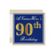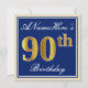 Este design de convite simples e bolsa mensageifesta de aniversario elegante apresenta uma mensagem personalizada como "Aniversário do 90 de ANameHere" (com o "90" a ter uma aparência falsa/de cor dourada) numa área quadrada de cor azul com um contorno de fronteira simples. O nome está em um texto elegante, de cor branca, parecido com script, e pode ser personalizado. A parte traseira apresenta detalhes personalizados do convite. Um convite de aniversário como este poderia talvez ser usado ao convidar pessoas para uma festa de aniversário em prisão preventiva para alguém que comemora seu nonagésimo aniversário. [~Z0000228]