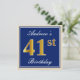 Este design de convite simples e bolsa mensageifesta de aniversario elegante apresenta uma mensagem personalizada como "Aniversário de 41ruas de Andrew" (com a "41rua" a ter um aspecto falsa/imitado de cor dourada) numa área quadrada de cor azul com um contorno de fronteira simples. O nome está em um texto elegante, de cor branca, semelhante a script, e pode ser personalizado. A parte traseira apresenta detalhes personalizados do convite. Um convite de aniversário como este poderia talvez ser usado ao convidar pessoas para uma festa de aniversário em prisão preventiva para alguém que comemora seu quarenta primeiro aniversário. [~Z0000228]