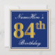 Este design de convite simples e bolsa mensageifesta de aniversario elegante apresenta uma mensagem personalizada, como "NameHere's 84th Birthday" (com o "84º" a ter uma aparência falsa/imitada de cor dourada), dentro de uma área quadrada de cor azul com um contorno de fronteira simples. O nome está em um texto elegante, de cor branca, semelhante a script, e pode ser personalizado. A parte traseira apresenta detalhes de convite personalizáveis. Um convite de aniversário como este poderia talvez ser usado ao convidar pessoas para uma festa de aniversário em prisão preventiva para alguém que comemora seu oitenta e quarto aniversário. [~Z0000228]