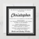 Bar de stripe branca e preto elegante, Mitzvah, convite. As informações do convite estão em um fundo branco. Personalize com as informações do seu bar mitzvah usando os modelos fáceis. A cor da fonte, o estilo da fonte e o tamanho da fonte são personalizáveis. Clássico e tradicional, o convite perfeito para o bar mitzvah.