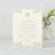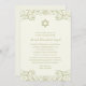 Este convite formal, elegante, do Bat Mitzvah apresenta uma estrela dourada de David e um design de ouro decorativo no topo e no fundo do convite. Personalize o convite com seus detalhes mitzvah.