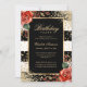 Belo convite de aniversário floral preto e dourado com rosas vermelhas de aquarela e confete de ouro contra fundo preto e branco. Personalize facilmente esta modelo a qualquer festa de aniversário.