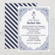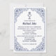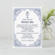 design de convite de festas de de primeira comunhão contemporâneo e elegante em uma fonte elegante de roteiro azul em uma estrutura azul decorada com espiral e fundo de flores.