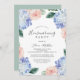 Este elegante convite de festas branco de hidromassagem azul é perfeito para um evento de primavera ou verão. O clássico design floral apresenta faixas de cor azul-d-água de pó macio, acentuadas com flores cor-de-rosa e folhas verdes, cor-de-rosa e borrado neutro.