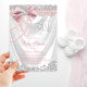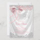 Convite de chá de fraldas cor-de-rosa pincelado com uma elegante cebola branca e pérolas bonito e arco rosa diamante num fundo branco de cetim. Este belo convite para chás de fraldas cor-de-rosa e prateado é facilmente personalizado para o seu evento simplesmente adicionando os detalhes do seu evento no estilo de letra e cor e na redação da sua escolha.