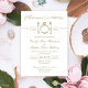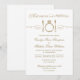 Um convite de casamento sofisticado com retrato que apresenta a frase "Coma, Beba e Case-se" em tipografia dourada ornamentada com uma ilustração detalhada de configuração de mesa, incluindo garfo, faca, prato e aliança. O design todo dourado em fundo branco exala elegância de jantar formal com nomes em caligrafia. Todo o texto é totalmente editável.