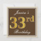Este design de convite simples e bolsa mensageifesta de aniversario elegante apresenta uma mensagem personalizada como "33º Aniversário de Jessica" (com o "33º" a ter um aspecto de coloração tipo ouro falso/imitação) numa área quadrada de cor castanha com um contorno de fronteira simples. O nome está em um texto elegante, de cor branca, parecido com script, e pode ser personalizado. A parte traseira apresenta detalhes de convite personalizáveis. Um convite de aniversário como este poderia talvez ser usado ao convidar pessoas a uma festa de aniversário para alguém que comemora seus trinta e três anos de aniversário. [~Z0000229]