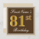 Este design de convite simples e bolsa mensageifesta de aniversario elegante apresenta uma mensagem personalizada, como "81ruas de Aniversário do Primeiro Nome" (com a "81ruas" com um aspecto de cor falsa/imitação em forma de ouro), dentro de uma área quadrada de cor castanha, com um contorno de fronteira simples. O nome está em um texto elegante, de cor branca, parecido com script, e pode ser personalizado. A parte traseira apresenta detalhes de convite personalizáveis. Um convite de aniversário como este poderia talvez ser usado ao convidar pessoas para uma festa de aniversário em prisão preventiva para alguém que comemora seu oitenta aniversário. [~Z0000229]