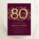 Elegante convite de aniversário de 80 de ouro de marrom. Design de vinho de marsala tinto escuro, personalizável, com acentos botânicos rosas e letra tipografia. Simples cartão de convite floral perfeito para uma comemoração de um na moda. Personalize com seus próprios detalhes. Impressos convites Zazzle ou modelo de impressão digital instantânea para download.