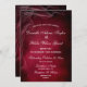 O texto branco em duas fontes contrastantes é contra um gradiente burgundy que apresenta uma sensata borda de fofoca. O texto está alinhado para que você possa digitar suas informações pessoais sobre o evento de casamento. Os nomes dos casais e algumas outras linhas estão em uma fonte elegante de script, enquanto o restante é uma fonte compacta sans serif.