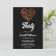 Este elegante convite de aniversário de outono é perfeito para um aniversário de outono moderno. O simples design apresenta um coração colorido de folhas de outono com elegante tipografia branca sobre fundo preto.