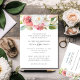 Caracteriza um design floral de jardim em aquarela elegante em tons de rosa, rosa e branco com folhagens e sotaques em turquesa. O verso do convite é emoldurado em florais de jardim correspondentes. Design©Rosalind Moore, Cherry Lane Designs.