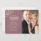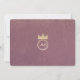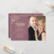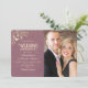 Luxuoso convite de casamento roxo elegante, com foto personalizada do casal e renda floral dourada vintage.