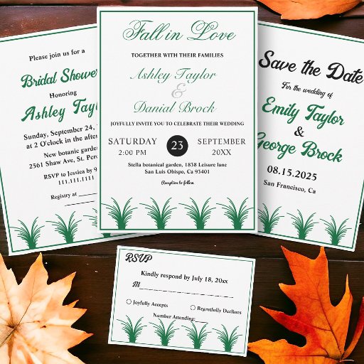 Este elegante convite de casamento outono é perfeito para um casamento moderno no outono. O simples design apresenta gramíneas verdes com elegante tipografia preta e verde sobre fundo laranja queimado