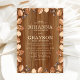 Convites de casamento de outono com floresta, apresentando um fundo de madeira rústica, folhas de carvalho outonais e um modelo de texto de casamento moderno que é fácil de personalizar.