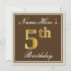 Este design de convite simples e bolsa mensageifesta de aniversario elegante apresenta uma mensagem personalizada como "Aniversário do 5 do Nome-Aqui" (com o "5" a ter um aspecto de cor falsa/imitação em forma de ouro) dentro de uma área quadrada de cor castanha com um contorno de fronteira simples. O nome está em um texto elegante, de cor branca, parecido com script, e pode ser personalizado. A parte traseira apresenta detalhes de convite personalizáveis. Um convite de aniversário como este poderia talvez ser usado ao convidar pessoas para uma festa de aniversário em prisão preventiva para alguém que comemora seu quinto aniversário. [~Z0000229]