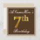 Este design de convite simples e bolsa mensageifesta de aniversario elegante apresenta uma mensagem personalizada, como "ANameHere's 7 Birthday" (com o "7" a ter uma aparência de cor dourada falsa/imitada), dentro de uma área quadrada de cor castanha com um contorno de fronteira simples. O nome está em um texto elegante, de cor branca, parecido com script, e pode ser personalizado. A parte traseira apresenta detalhes de convite personalizáveis. Um convite de aniversário como este poderia talvez ser usado ao convidar pessoas para uma festa de aniversário em prisão preventiva para alguém que comemora seu sétimo aniversário. [~Z0000229]