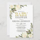 Adoráveis convites para bebês florais de aquarela. As cores das flores são cor-de-rosa, marfim, creme com folhas verdes e pastel macio. Perfeito para qualquer tema, hora ou ano, neutro, unísexo, menino ou menina. BABY em letras falsas de ouro. A parte traseira do cartão tem o primeiro ou sobrenome de BABY.