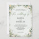 Apresenta folhas de cor aquosa verde de eucalipto com design de ouro elegante. Personalize o cartão com noiva, data do noivo, local e hora do casamento. Para mais personalizações ou como este design em outro produto, entre em contato conosco em karuna@karunaskreations.com.
