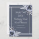 Isso é personalizável e um elegante azul empoeirado e cinza floral branco Salve o convite de casamento da Data com flores azuis claras e azuis marinhos de cor d'água em um design azul empoeirado de fundo. É perfeito para uma celebração de casamento no inverno floral.