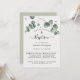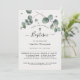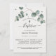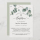 Elegante botânico Eucalipto Primeiro Sagrado Convite Comunitário. Apresenta um arranjo de folhas e folhagem de cor aquosa de eucalipto, que leva ao título em letra chic manuscrita.