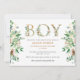 Elegante Eucalyptus Greenery Dourado Baby Boy Invitation - Comemore a chegada do seu bebê precioso com este elegante, moderno e bonito "Convite ao Chá de fraldas" horizontal, com uma folha de ouro como o alfabeto "Boy", decorado com folhagem de algodão branco e folha de eucalipto verde em cada lado. O plano de fundo apresenta cor verde de sábio. Todos os textos estão pré-organizados para que você personalize fácil e rapidamente com os detalhes do seu chá de fraldas.
