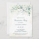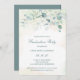 Festa de formatura elegante, com folhas de eucalipto e verde, com uma dica de azul e brilho de ouro falso no topo. Abaixo estão os detalhes de seu evento em verde escuro, sobre uma lavagem a água pastel. A parte de trás é uma sombra correspondente de verde azul macio. Esta simples e rústica design é excelente para uma celebração do tema botânico.