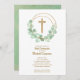Os primeiros convites de comunhão elegantes apresentam uma cruz falsa dourada, uma coroa de folhas de eucalipto e seus detalhes em letra chic na frente. Os pontos Dourados de uma aquarela verde são apresentados no verso, perfeito para a primeira comunhão, batismo ou batizante do seu filho. Itens CORRESPONDENTES disponíveis em nossa loja.