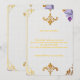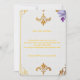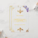 Um elegante desenho de fleur-de-lis dourado adornando os cantos do seu convite de casamento irá definir o tom do seu dia especial. O padrão intrincado e design sofisticado criam um toque lindo e atemporal que complementa perfeitamente qualquer tema de casamento. Perfeito para celebrações de casamento formais ou elegantes, este quadro está pronto para mostrar o seu convite com estilo.
