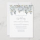 Este design apresenta uma elegante floral azul-poeirenta, elegante, com folhas de rosa azul-claro, elegante prata azul-clássica floral, uma caligrafia romântica formal clássica, monograma verde simples minimalista, folha folhagem floral com cor-d-água, folhas de eucalipto folhas verdes prateadas, simples roteiro elegante e mínimo botânico moderno, tipografia na moda-trendy tradicional azul-claro clássico de casamento, bela elegância bonito simplista