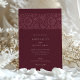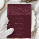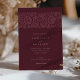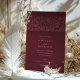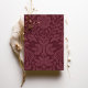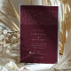 Este elegante convite para o casamento apresenta um fundo burguês profundo, enfeitado com intrincados padrões florais em tons compatíveis, criando uma sofisticada e eterno estética. A frente do convite mostra um motif floral bem detalhado no topo, aliado a tipografia elegante que graciosamente apresenta os detalhes do casamento. O verso continua o tema floral com iniciais personalizadas, oferecendo um design harmonioso e sem descontinuidades. Perfeito para casais que buscam um olhar moderno, mas clássico, a paleta rica e luxuosa de cores desse convite adiciona um toque de elegância rara, fazer ideal para casamentos formais e românticos.