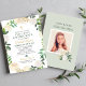 Esta cerimônia de Santa Comunhão e convite para comemoração de almoço para uma menina apresenta uma elegante redação personalizada para o seu evento especial, acentuada por uma cruz de ouro e emoldurada por uma bela coroa floral de jardim, branca neutra, rosa-pincel e rosa de cor creme, com verde e verde-ouro. Um fundo verde suave com espaço de fotos aparece na parte traseira da placa. Personalize o texto do "Deus abençoe" com o nome da filha no script.
