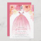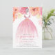 Um design de vidro de Quinceanera com a vista de trás de uma garota com um lindo vestido de bola rosa e dourada e florais bonito decorando o topo. Personalize facilmente o texto para seus detalhes. Um fundo cor-de-rosa coordenado também está atrás.