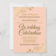 Este belo convite de casamento é elegante, simples e sofisticado. Apresenta letras em escrita dourada sobre um fundo coral pêssego ou laranja claro com filigrana floral em folha falsa em cada canto. O design discreto é compensado pelas rendas ornamentadas e espirais da obra de arte.