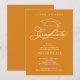 Um boné de formatura e a palavra "formando" em um roteiro elegante e branco, MAIS o nome e o ano do seu formando e suas informações sobre esses convites de festa de formatura laranja-claro. CONSULTE TODA A RECOLHA de cores pré-feitas, placas de papel, guardanapos, tampas de bonés de formando e muito mais em nossa loja.