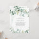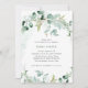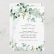 Este batismo religioso tendencioso ou convite de Natal apresenta uma elegante aquarela eucalipto verde, com muitas folhagem, folhas verdes e galhos. Eles decoram um simples fundo branco com a tipografia moderna da escrita e uma falsa cruz de ouro.