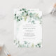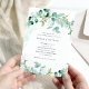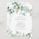 Este convite para chás de casamento de tendências apresenta uma elegante cor d'água eucalipto verde, com muitas folhagem, folhas verdes e galhos. Eles decoram um simples fundo branco com texto moderno clássico e salpicos sutis de aquarela.