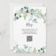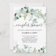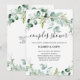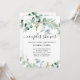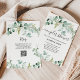Este convite para chás de casamento de tendências apresenta uma elegante cor d'água eucalipto verde, com muitas folhagem, folhas verdes e galhos. Eles decoram um simples fundo branco com a tipografia moderna da escrita. A parte traseira da placa tem um ponto para um código QR digitalizável para que os convidados possam facilmente rsvp. A maneira perfeita de convidar amigos e família para comemorar!