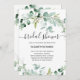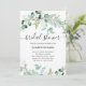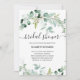 Este chá de panela de tendência apresenta uma elegante aquarela eucalipto verde, com folhagem abundante, folhas verdes e ramos. Eles decoram um simples fundo branco com a tipografia moderna da escrita. A parte traseira da placa tem um ponto para um código QR digitalizável para que os convidados possam facilmente rsvp. A maneira perfeita de convidar amigos e família para celebrar a noiva a ser antes do seu casamento!