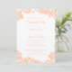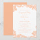 O elegante design de convite de festa de noivado de renda romântica apresenta um fundo branco crocante com renda falsa em pêssego ornamentada nos cantos do design na frente. Personalize o design com seus detalhes em letras e caligrafia da moda em pêssego clássico. O verso combina com pêssego da moda. Para obter os melhores resultados, substitua os detalhes do modelo pelos seus detalhes, deixando espaço entre os parágrafos como no exemplo. Envie um e-mail para invitationsuites@gmail.com com perguntas ou solicitações de cores personalizadas.
