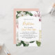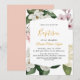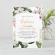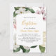 Celebre esta ocasião especial com um toque sofisticado. Este convite batismo apresenta uma mistura graciosa de peões cor-de-água, cor-de-rosa pincelada, magnólia branca refinada floresce e ouro e folhagem verde. Perfeito para um evento moderno e clássico, seu design floral suave exude elegância do eterno.